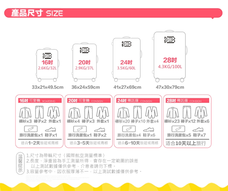 ◆尺寸(長*厚*高,含輪高):20吋/約36*24*59cm