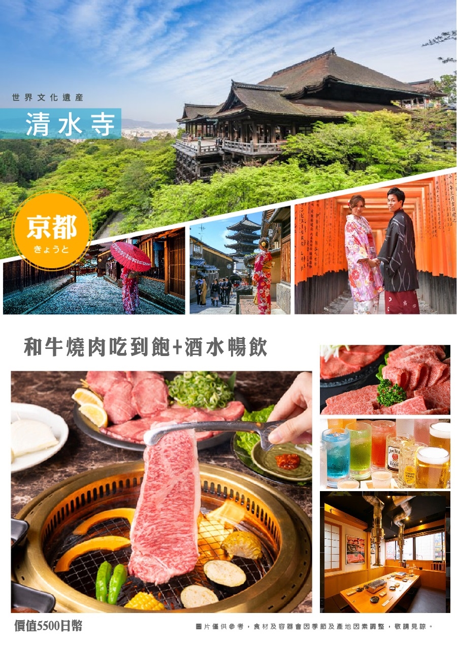 【天橋立】位於京都府北部的風景勝地;在全長約3.6 km 的沙洲上,種植了約8,000株的松樹,排列在沙洲兩旁連綿不斷,與宮城縣的松島、廣島縣的宮島並列為日本三景之一。相傳天橋立是神明往來天庭與人間的橋樑,由于其形狀看似天上舞動的橋樑,俯首從雙足之間觀賞之,猶如升天之龍,所以取名為『天橋立』。 【傘松公園】於成相山山腰上是可將天橋立周邊美景盡收眼底的最佳地點,站在著名的「胯間展望台」上,彎下腰由兩腿之間看出去,讓天幕與海面顛倒過來,天橋立彷彿是一條在空中騰雲駕霧的飛龍,又像是一座從天而降的一字橋,您可以讓想像力自由馳騁,靜心觀察大自然優美絕妙的巧奪天工。 【美山町合掌造】美山町北村、岐阜縣白川鄉、福島縣大內宿,並列日本三大「かやぶきの里」,北村於西元1993年12月8日被選定為重要傳統建造物群保存地區,悠閒的田園風景和草頂房屋相稱,古建築之純樸典雅之美,有如童話般的村落已然成為遊客流連忘返的世外桃源,更是攝影愛好者拍照首選。沿河岸建築的茅茸合掌屋,層層疊疊錯落有致,靜謐美麗的風景被日本媒體譽為「日本人心靈的故鄉」,和白川鄉合掌村、福島縣下鄉町的大內宿並列為日本3大合掌村。在每年春、秋季,會各舉行一次消防演習「一齊放水」;在一月下旬晚間,則會舉辦冬季限定「雪燈廊」,點點燈火如天上繁星墜落,照亮覆蓋靄靄白雪的小屋群,如夢似幻。 【大阪免稅店】店內琳瑯滿目的各式各樣的禮品,讓您有充份地選擇贈送親朋好友的禮物,當然您也可以為您自己選購適合的禮品喔! 【道頓堀】是沿著道頓堀川南岸的一大繁華美食街,日本人常說吃在大阪,可見這裡的飲食店之多,在此您一定不可錯過大阪著名的各式小吃,如章魚燒、大阪燒、金龍拉麵…等等!還有成遍的娛樂設施,是最受大阪市民歡迎的地方。 【心齋橋】是以帶有拱廊設施的心齋橋筋商店街中心發展起來的,也是大阪最大的購物區,這裡集中了許多精品屋和專賣店,大型百貨店、百年老鋪、各種小店鋪鱗次櫛比 早餐:飯店內享用 午餐:為方便逛街 敬請自理 晚餐:★特別安排 和牛燒肉吃到飽+酒水暢飲 5500 |