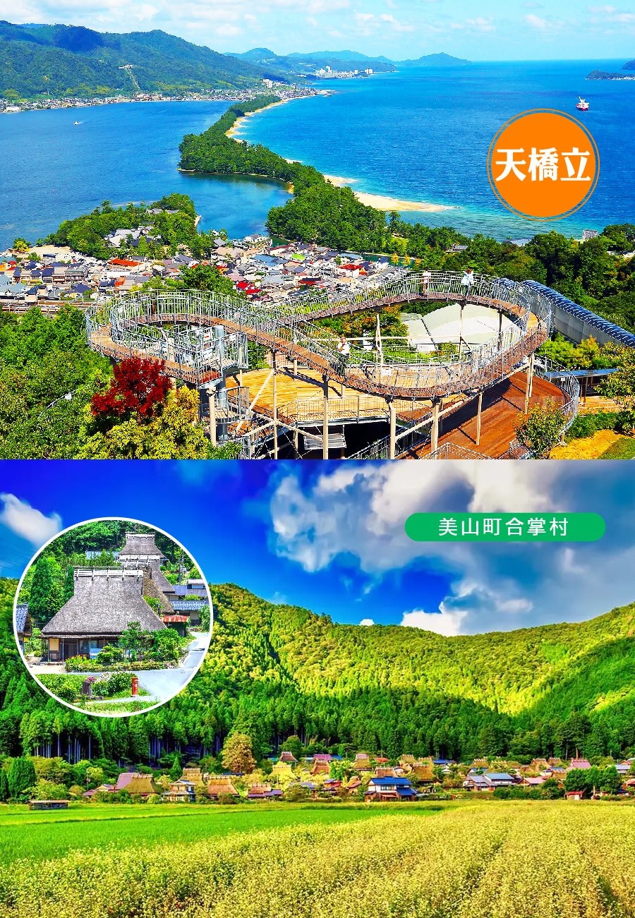 【第2天】 飯店→海之京都.日本三景之一~天橋立~傘松公園 或 天橋立view land~★安排搭乘纜車一睹「飛龍觀」/「升龍觀」奇景)→★日本三大合掌村之一~被日本媒體譽為日本人心靈的故鄉~京都美山合掌村.茅草屋之鄉→免稅店→★特別安排和牛燒肉吃到飽+酒水暢飲→飯店→自由逛街道頓崛、心齋橋、御堂筋大道或梅田地下街 |