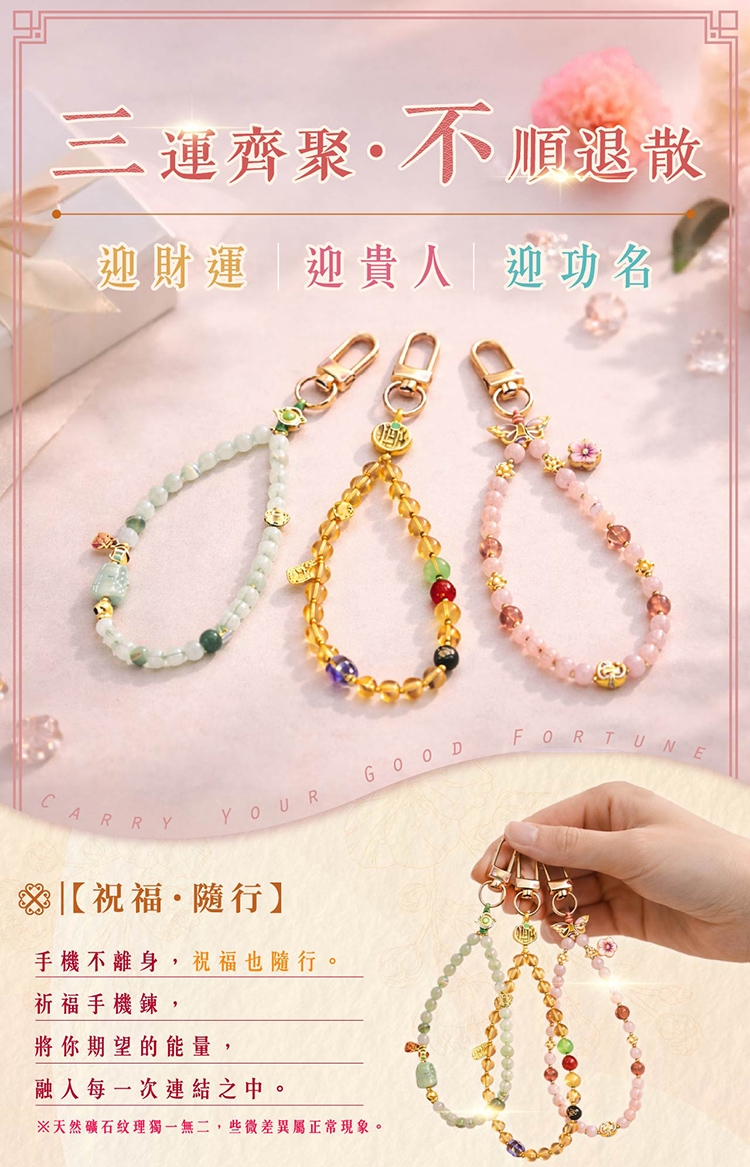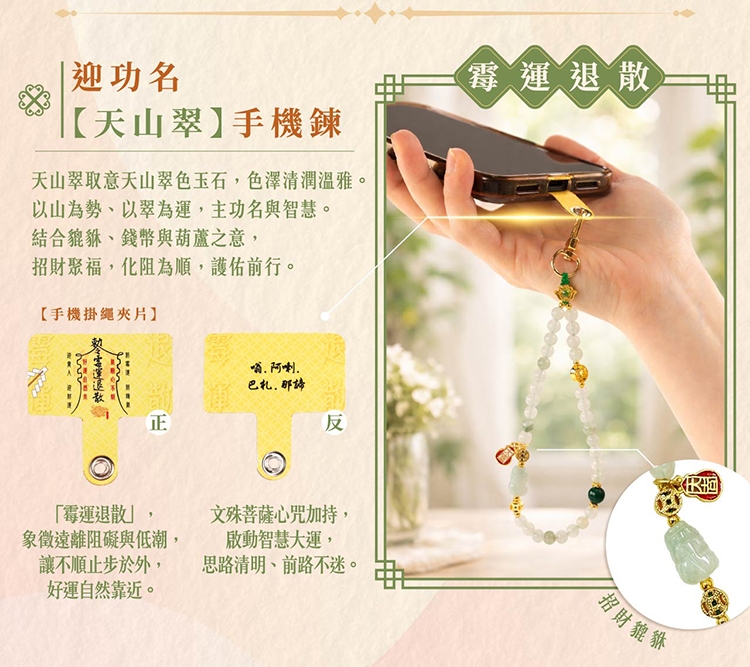 商品材質/成分/規格:吊牌:塑膠、紙 / 手機鍊:天山翠(石英岩)、孔雀石、銅合金 / 貔貅:緬甸玉