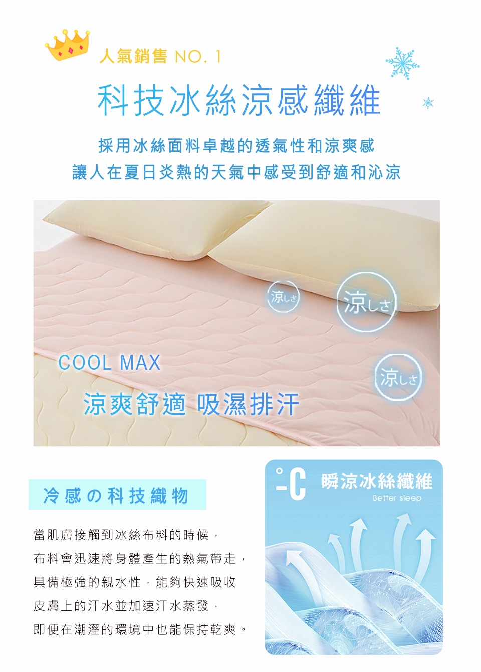 觸感涼爽,手感細膩絲滑,接觸後肌膚能瞬間感到冰涼舒適。