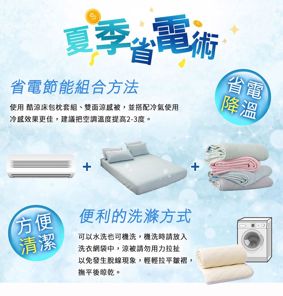 • 省電的必要寢具 - 氣溫較高時,建議搭配透氣床墊及空調,使用時,可將空調度適當提高2-3度,讓睡眠持續涼爽更節能。
