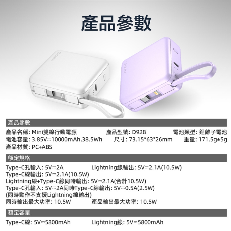 額定容量:Type-C線:5V⎓5800mAh Lightning線:5V⎓5800mAh
