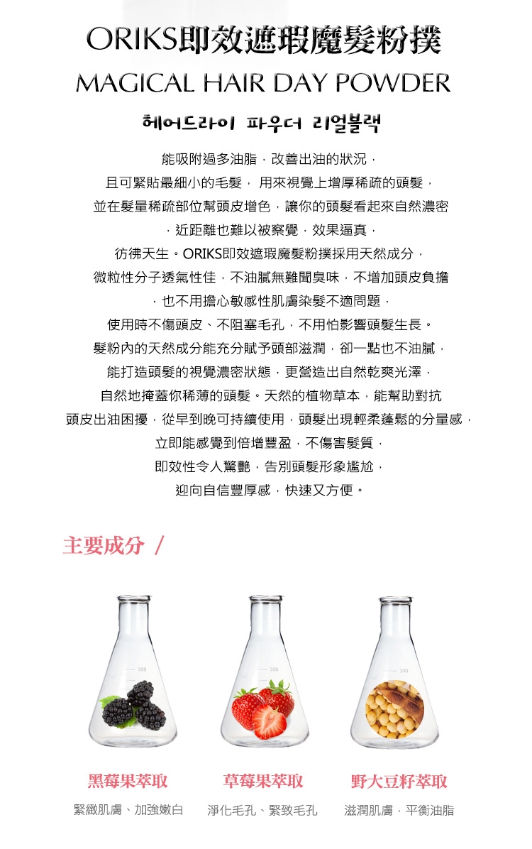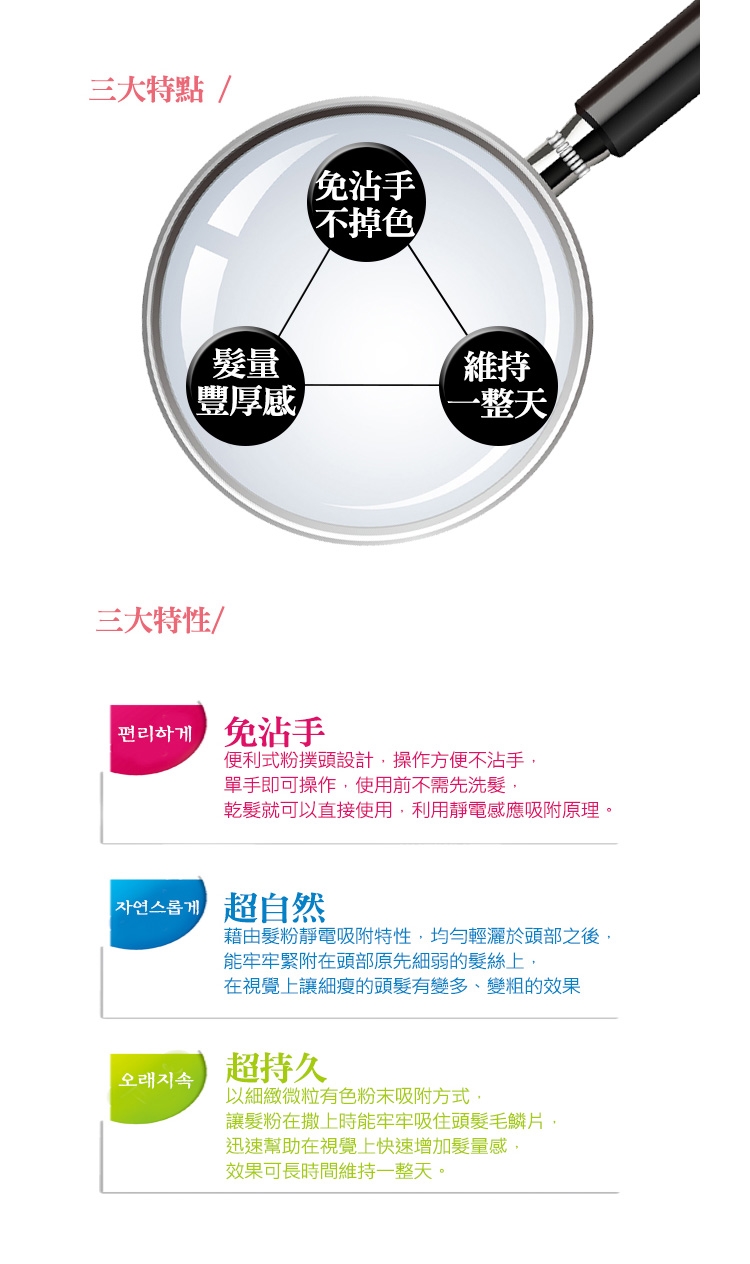 3.初次使用時,請先在手背上輕拍數次,確認魔髮粉已沾染至粉撲上,再開始使用。