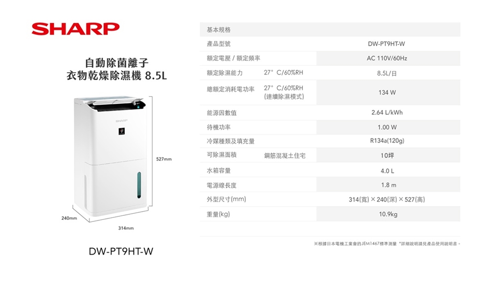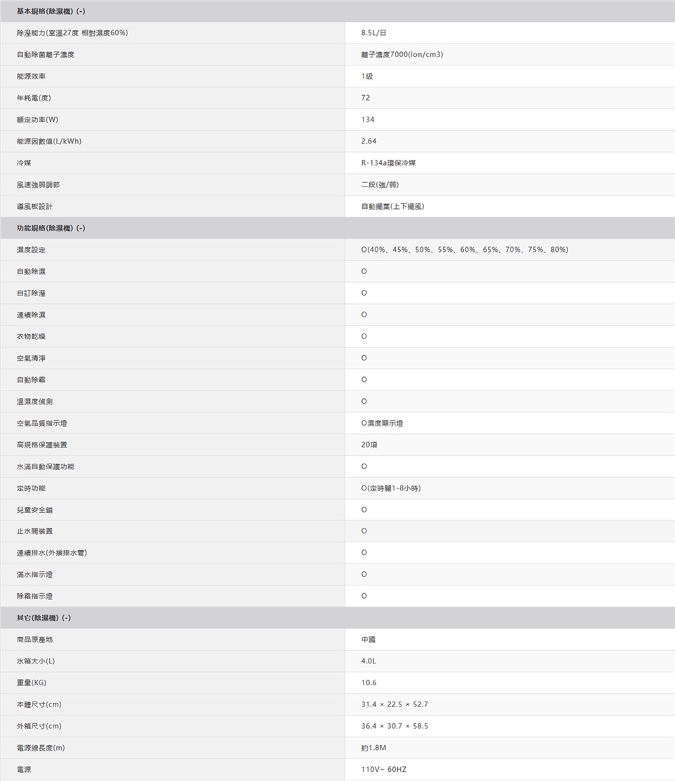 • 除濕能力8.5L/日 (B式 /室溫27 ℃/相對濕度60%)