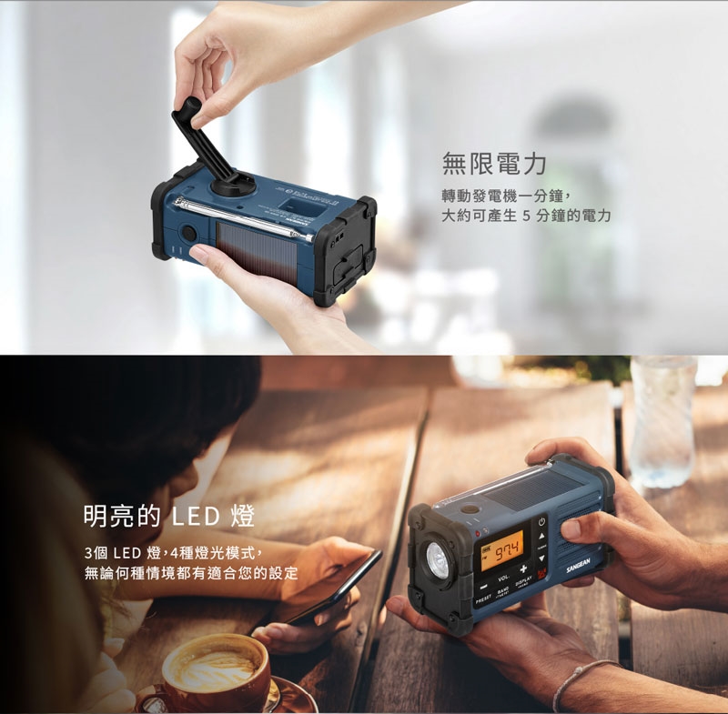 手搖式充電,手搖一分鐘可供收聽5分鐘