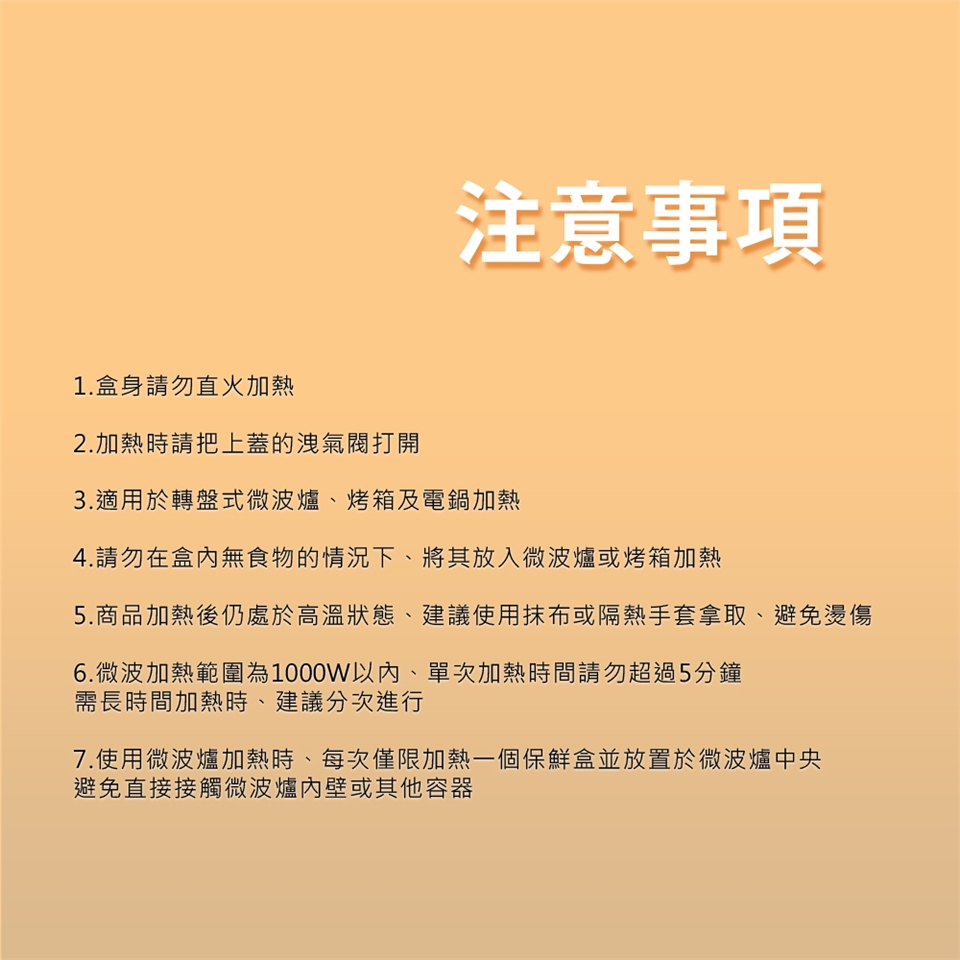 7. 使用微波爐加熱時,每次僅限加熱一個保鮮盒,並放置於微波爐中央,避免直接接觸微波爐內壁或其他容器。