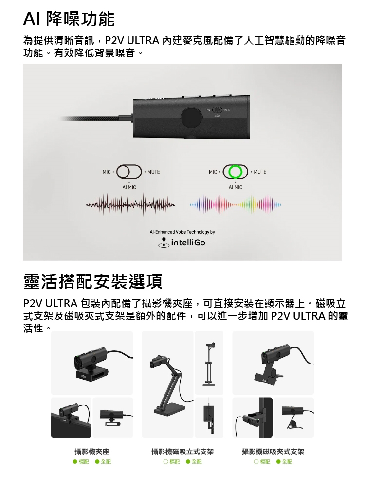 🔹包裝內容物:P2V ULTRA攝影機附帶USB連接線180 公分、攝影機夾座、磁吸立式支架、磁吸夾式支架、Type-C 轉USB接頭、快速入門指南