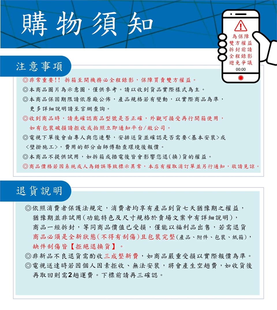 📌拆封請全程錄影為了保障雙方權益,請您在開箱過程中務必全程錄影,以確保商品是否遺漏。寄錯、缺貨、瑕疵品等,請皆以「完整錄影檔」為依據,(從外送箱未開封的完整狀態開始拍攝才是完整錄影檔)。影片需清楚拍攝【未拆封狀態】、【開箱過程】、【物件本體】、【貨品明細】等。影片需提供「原檔清晰開箱影片」,快轉或有明顯剪輯痕跡的影片皆不在受理範圍。