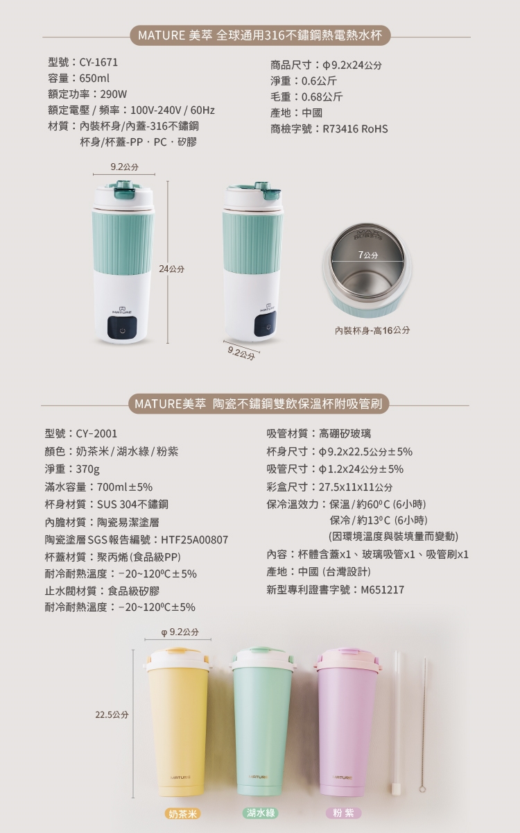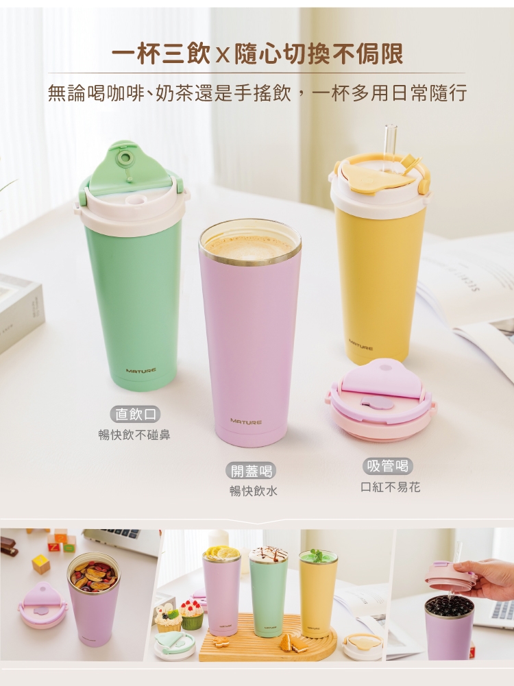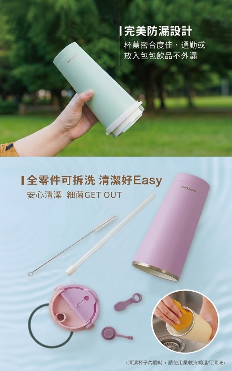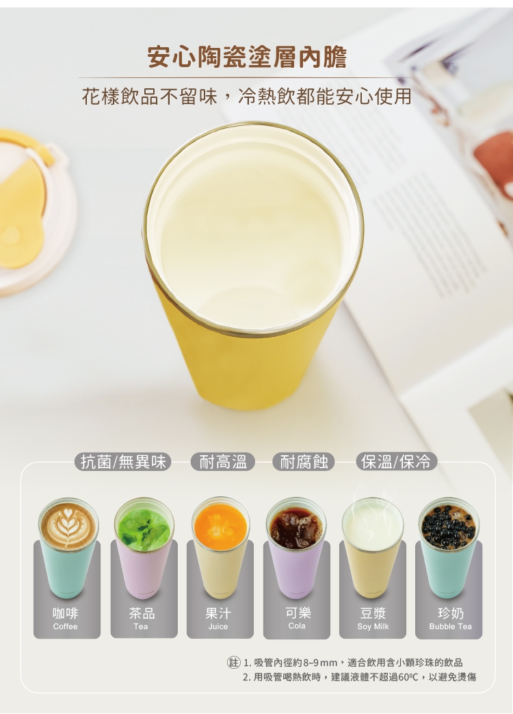商品材質:杯身-SUS304不鏽鋼、內膽-陶瓷易潔塗層、杯蓋-聚丙烯(食品級PP)、止水閥-食品級矽膠、吸管-高硼矽玻璃