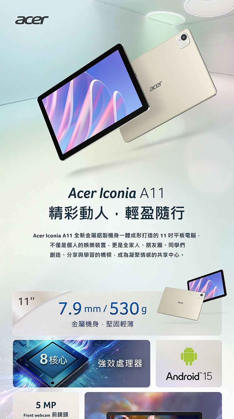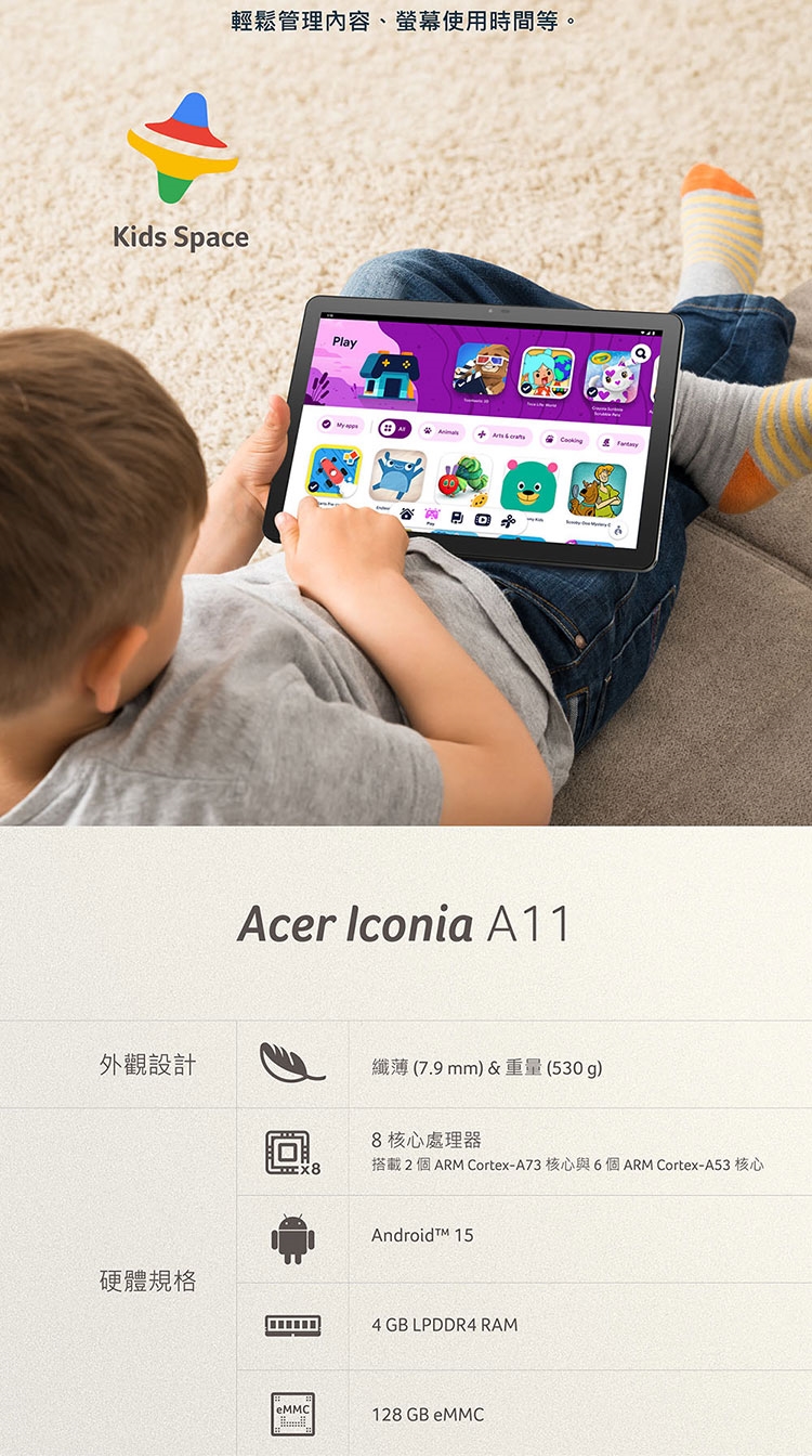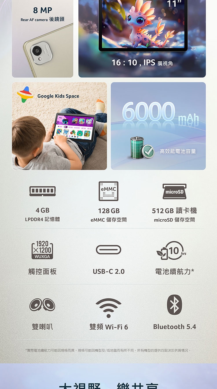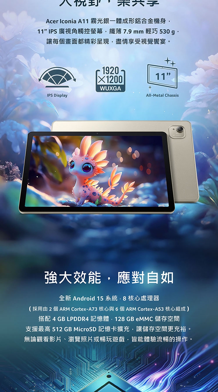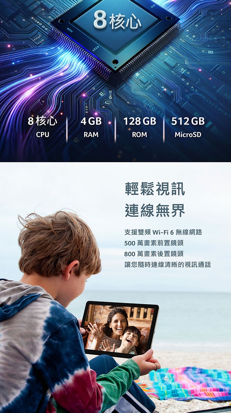 ★ 8核心處理器、4GB LPDDR4記憶體、128GB eMMC儲存空間