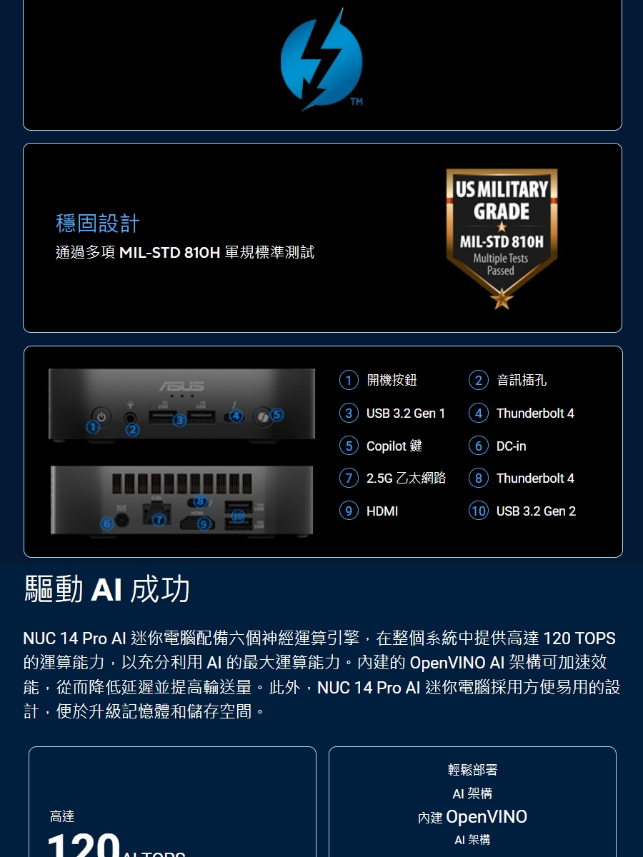 | 介面 | Front & Side I/O (Top) 1 x Finger Print module (Front) 1 x Power button 1 x Copilot button 1 x Thunderbolt™ 4 Type-C w/ DisplayPort 2.1 2 x USB 3.2 Gen1 Type-A 1x 3.5mm Headset Jack (Side) 1 x Kensington Lock slot Back I/O 1 x Thunderbolt™ 4 Type-C w/ DisplayPort 2.1 2 x USB 3.2 Gen2 Type-A 1 x HDMI 2.1 (TMDS) 1 x 2.5G RJ45 LAN 1 x DC-in |