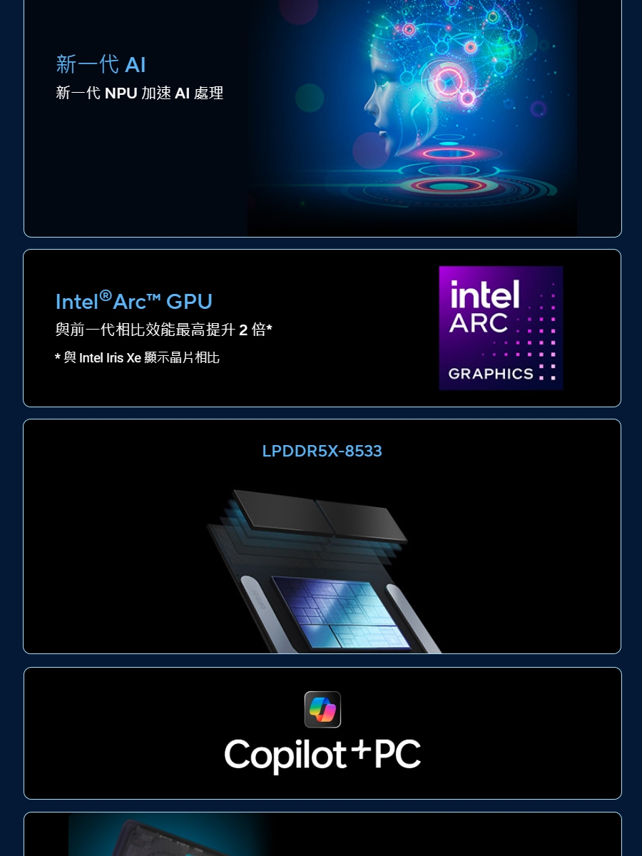 | 顯示卡 / 繪圖支援 | Integrated - Intel® Arc™ Graphics |