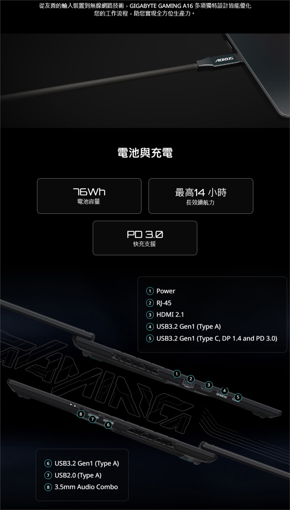 | 連接埠 | Left side: 1 x DC-in 1 x RJ-45 1 x HDMI 2.1 1 x Type-A support USB3.2 Gen1 1 x Type-C USB3.2 Gen1 support DisplayPort™ 1.4 and Power Delivery 3.0 Right side: 1 x Type-A support USB3.2 Gen1 1 x Type-A support USB2.0 1 x 3.5mm Audio Jack support mic / headphone combo |