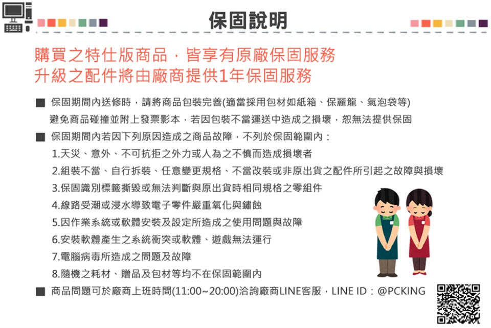 | 備註 | 特仕機種升級配件廠商提供1年保固服務 |