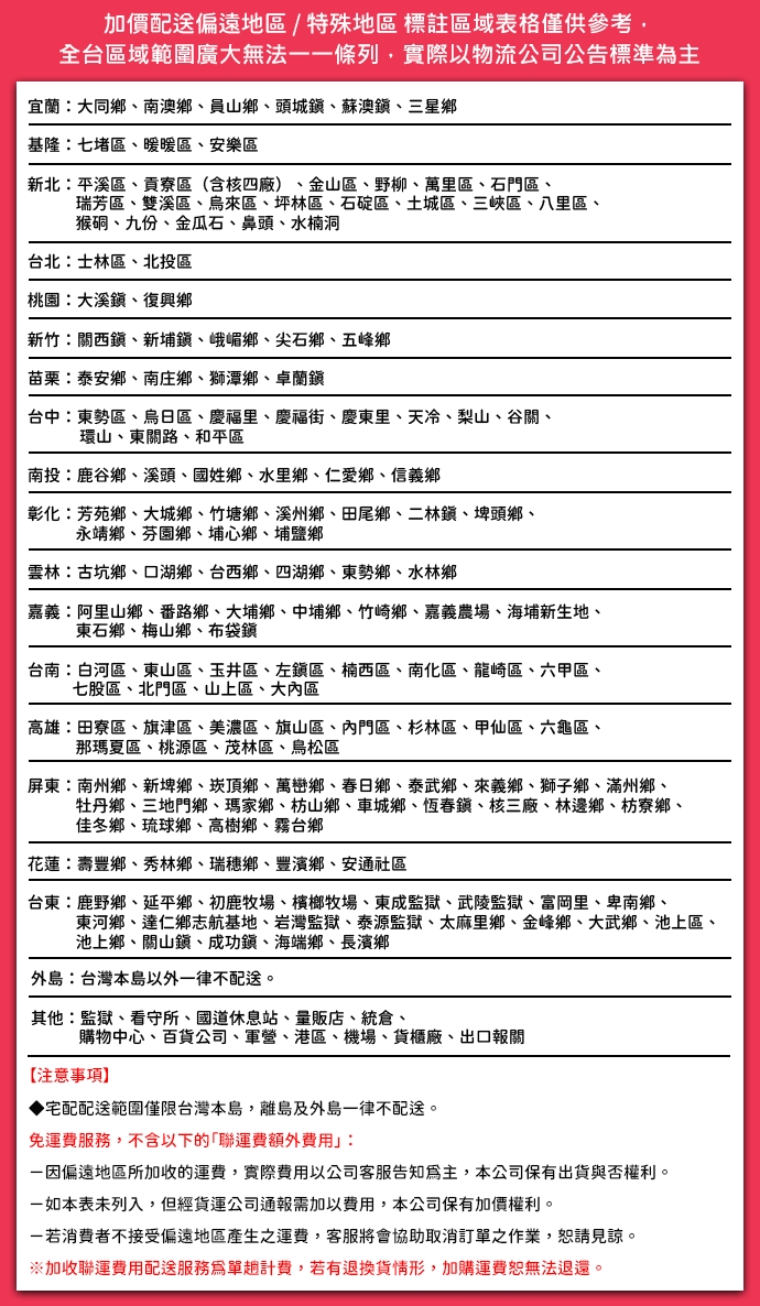 ■部份地區,偏遠/特殊地區無法配送或需加收額外運費,訂購後會有專人與您連繫額外費用的繳納