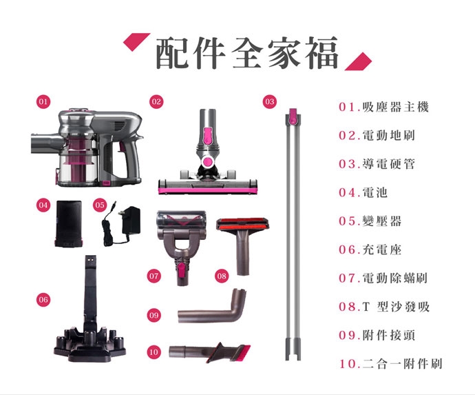 ★配件:電動地刷、二合一附件刷、T型沙發吸、附件轉接頭、電動除蟎刷、導電硬管
