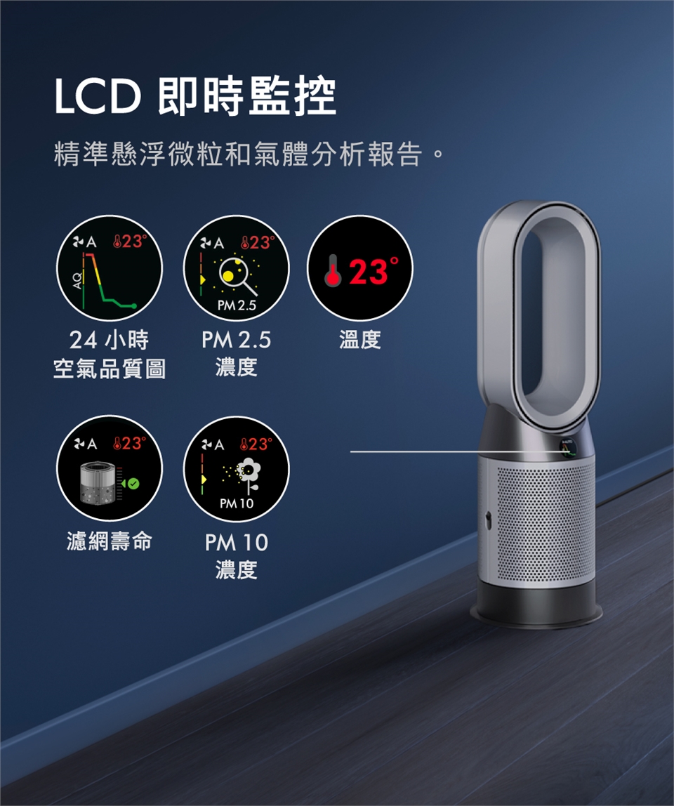 即時LCD顯示螢幕:PM2.5濃度/PM10濃度/溫度/濾網使用壽命