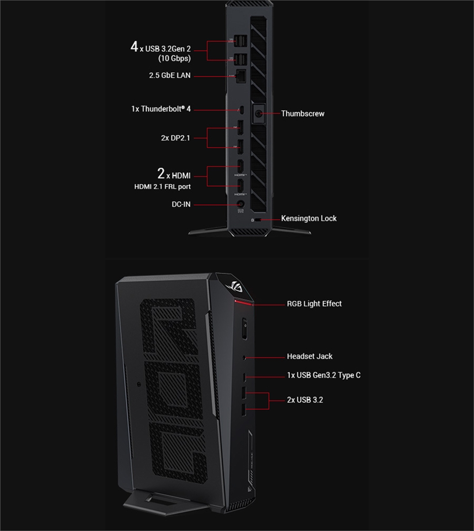 | 介面 | 前(側)置: 2 x USB 3.2Gen2 Ports 1 x USB-C 後置: 1 x Thunderbolt™ 4 / USB4 Type-C port with DP 2.1 and (5V@3A / 5V@1.5A / 9V@2A / 12V@1.5A) fast charging profiles 2 x HDMI Ports 2 x DP Ports 4 x USB 3.2 Gen2 Ports |