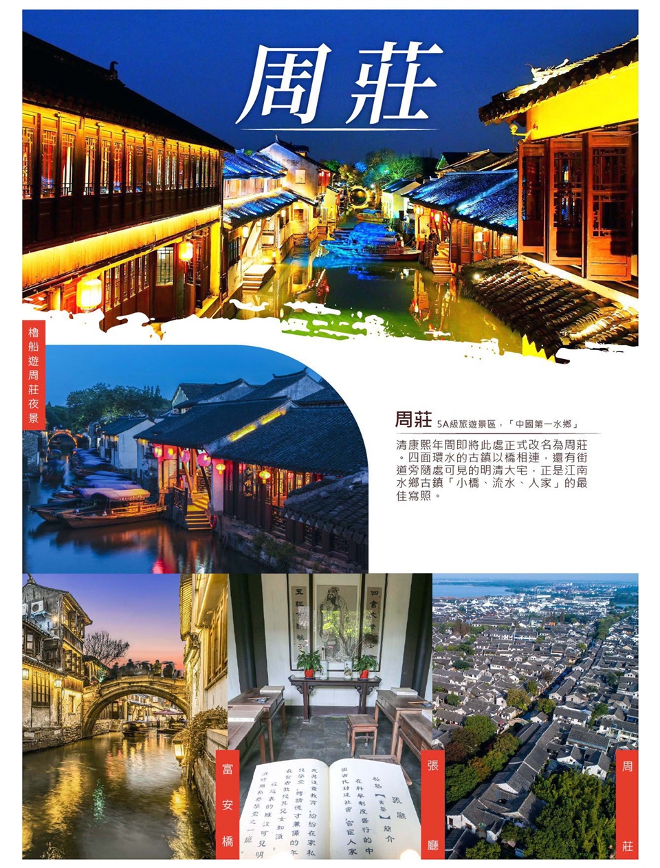 【櫓船遊周莊夜景】周莊處處美景如畫,夜晚更顯沈靜優雅,別有一番古色古香的韻味,小河中的傍水燈,映照在拱橋與建築上,更加襯托出江南水鄉迷人的景色,不論是步行或是乘坐在小船上,靜靜地欣賞河中古宅與彎彎拱橋的完美倒影,詩情畫意美不勝收,不禁讓人沈浸在水鄉古鎭的魅力當中! 早餐:X 午餐:X 晚餐:水鄉風味 |