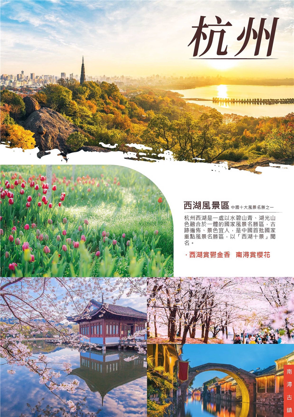 【周莊】5A級旅遊景區,「中國第一水鄉」之稱,全鎮因河成街,呈現一派古樸且明亮的幽靜。周莊原名為貞豐里,相傳為吳地文化孕育之地,到了元、明朝代因人口漸漸密集加上商業的發展,城鎮範圍也逐漸擴大;清代時期,貞豐里已成為江南商業大鎮,清康熙年間即將此處正式改名為周莊。四面環水的古鎮以橋相連,還有街道旁隨處可見的明清大宅,正是江南水鄉古鎮「小橋、流水、人家」的最佳寫照。 ◆沈萬三故居:沈萬三為浙江人,隨父遷居周莊,因經商對外貿易成為江南首富而成名。故居中依照其一生經歷與典故設計,修建為仿明式復古建築,陳設了沈萬三銅像、實景模型、精美的磚雕、沈萬三水底墓等等,充份展現出一代富豪的形象,也結合了水鄉旅遊與人文景觀。 ◆張廳:這裡歷經五百多年滄桑,堅實的石柱,細膩精良的雕飾,仍不難看出張廳昔日的風采。大廳軒敞明亮,庭柱下為罕見的木鼓墩,是明代建築的明顯標誌。 ◆雙橋:俗稱鑰匙橋,由一座石拱橋世德橋和一座石梁橋永安橋組成。石拱橋橫跨南北市河,橋東端有石階引橋,伸入街巷;石梁橋平架在銀子浜口,橋洞僅能容小船通過,橋欄由麻條石建成。 ◆富安橋:相傳橋旁有總管廟,所以它原名總管橋。橋的四個角上都有一座樓房,而且樓房一、二樓之間是沒有樓梯的,必須走到外面橋階上繞上去,橋上有五塊江南一帶罕見的武康石。 ◆美食特產:具有傳奇性色彩的「萬三蹄」最有代表性,相傳是江南富豪沈萬三家中宴席必備的名菜;其它特色小吃還有萬三糕、阿婆茶、熏青豆等等,遊玩水鄉的同時,別忘了品嚐一下道地的江南小吃。此外 ,周莊的竹製品在清朝時期即已聞名八方,原本是以製作當地生活用品為主,如今,用竹條編成的手工藝品如竹絲扇、竹席…,也成為遊客最喜愛的拌手禮了。 【西湖】三面環山,層巒疊嶂,南北長3.3公里、湖岸周長15公里、湖面及湖中島嶼面積分別為5.68平方公里及6.3平方公里,蘇堤與白堤橫跨湖面、孤山是杭州西湖中最大的天然島嶼,三者將西湖分隔為外西湖、小南湖、裡西湖、後西湖及嶽湖等五湖;湖心亭、小瀛洲及阮公墩等三個人工島嶼佇立於外西湖湖心,由此形成杭州西湖「一山、二堤、三島、五湖」的基本格局。 【太子灣公園】相傳公園前身曾是南宋皇室莊文及景獻兩位太子當年暫時停棺的地方,因而得名「太子灣」。陽光正好,“冒頭”的鬱金香明顯增加了。白黃色相間的鬱金香“糖果”像一個美麗的少女盛放,鬱金香“白雪公主”已經露出了潔白碩大的花苞,隱藏在碧綠的葉下。 【明清河坊商店街】這裡都是明清時代的建築群及穿著明清時代衣衫的人員,你會被眼前的景色所驚歎,甚至心醉神馳,懷疑自己是否進入了世外仙境回到數百年前的場景。 早餐:酒店內 午餐:萬三蹄風味 晚餐:方便逛街、敬請自理 |