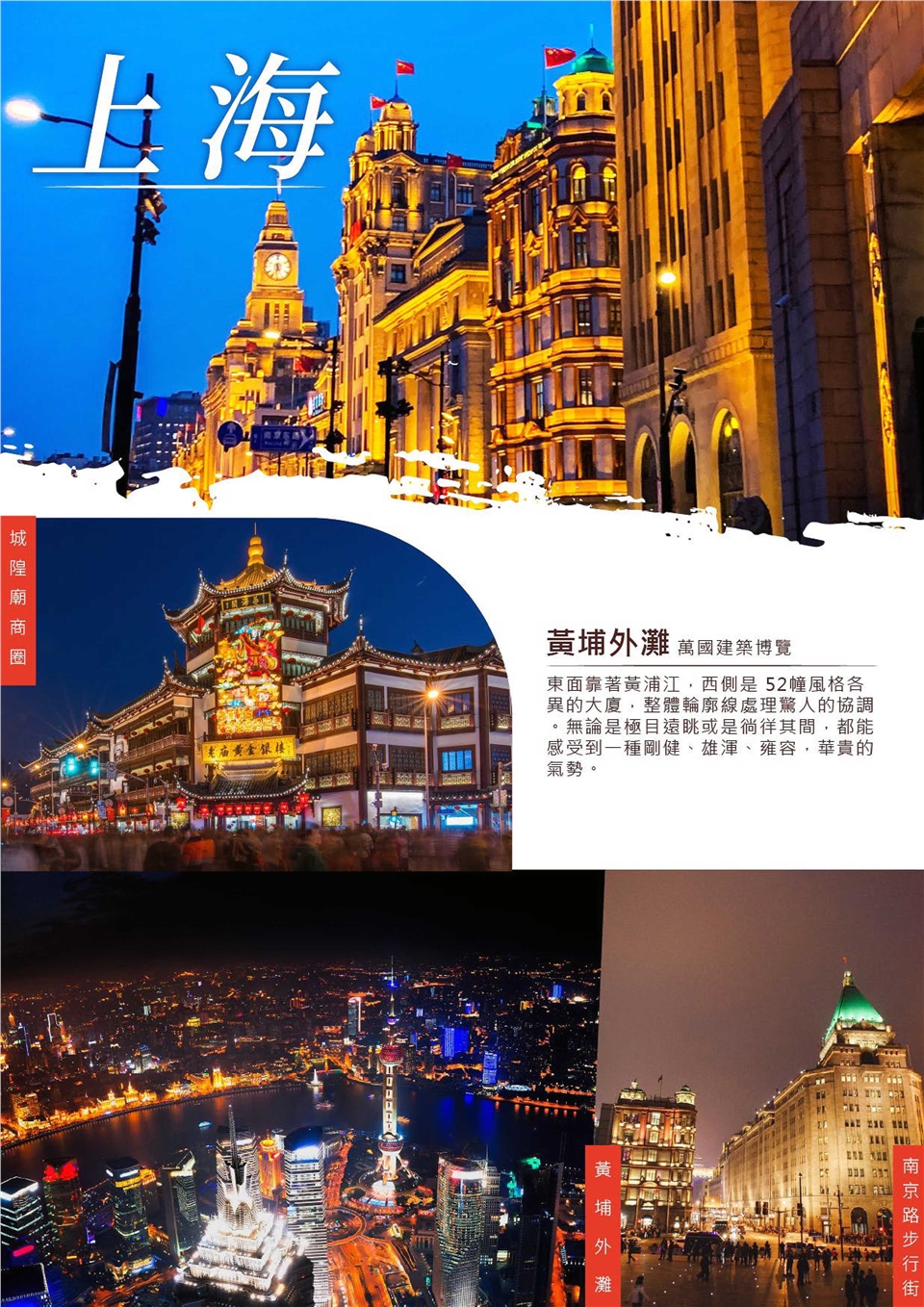 【城隍廟商業區】“到上海不去城隍廟,等於沒到過大上海。”這裡可說是古代建築的博物館,上海建城700餘年,明、清、民國的住宅建築星羅棋佈,“購物天堂”又是城隍廟的一大特色,商品以日常生活用品為主,琳瑯滿目、應有盡有,商品有小、土、特、多等特點,花色達萬種以上。 【南京路步行街】全長約1033公尺、寬4.2公尺,擁有許多老字號的店鋪,為結合傳統與現代化的大街,是集購物旅遊、文化展示及商務於一體,因此擁有「中華商業第一街」的美名,是上海著名的購物旅遊熱門景點。 【黃埔外灘(萬國建築博覽群)】東面靠著黃浦江,西側是52幢風格各異的大廈,外灘的精華就在於這些被稱為“萬國建築博覽”的外灘建築群。著名的中國銀行大樓、和平飯店、海關大樓、匯豐銀行大樓再現了昔日“遠東華爾街”的風采,這些建築雖不是出自同一位設計師,也並非建於同一時期,然而它們的建築色調卻基本統一,整體輪廓線處理驚人的協調。無論是極目遠眺或是徜徉其間,都能感受到一種剛健、雄渾、雍容,華貴的氣勢。 早餐:酒店內 午餐:上海本幫菜 晚餐:方便逛街、敬請自理 |