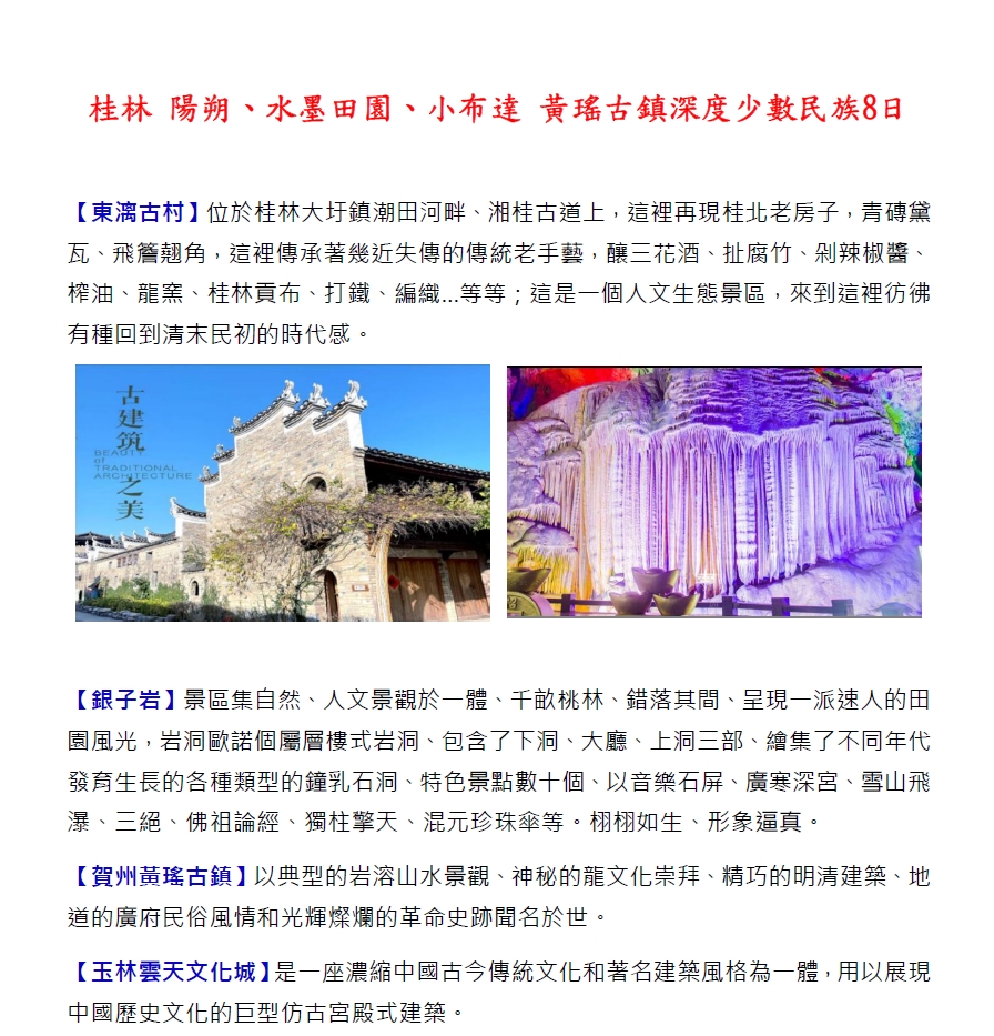 【第4天】 陽朔-2H-賀州【黃瑤古鎮、玉石林景區、靈峰廣場】 |