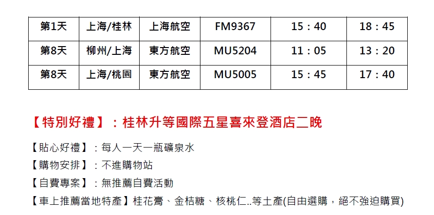 今日集合於機場,豪華飛機前往【上海】是一座極具現代化而又不失傳統特色的國際大都市,百餘年來一直是中國的金融、貿易、文化中心,是財富聚集的寶地。抵達後於機場內轉機前往廣西第三大城市【桂林】。桂林屬於典型的「喀斯特」巖溶地貌,遍佈全市的石灰岩經億萬年的風化浸蝕,形成了千峰環立、一水抱城、洞奇石美的獨特景觀,被世人美譽為「桂林山水甲天 早餐:自理 中餐:自理 晚餐:自理(贈送: 桂林米粉小吃) |