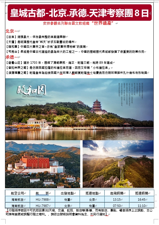 【避暑山莊】又名“承德離宮”或“熱河行宮”, 承德避暑山莊清康熙四十二年(1703年)開始大規模修建, 是中國清朝皇帝為了實現安撫、團結中國邊疆少數民族,鞏固國家統一的政治目的而修建的一座夏宮。 承德避暑山莊佔地564萬平方米, 主要分為宮殿區和苑景區(湖泊區、平原區和山巒區)兩部分。承德避暑山莊不同於其它的皇家園林,它繼承和發展了中國古典園林“以人為之美入自然,符合自然而又超越自然”的傳統造園思想,按照地形地貌特徵進行選址和總體設計,完全藉助於自然地勢,因山就水,順其自然。它集中國古代造園藝術和建築藝術之大成,是具有創造力的傑作。 【車遊海河】沿途的景色成為天津旅遊的特色,像是大悲院文化商貿區、引灤入津工程紀念碑、天津古文化街旅遊區(津門故里)、大沽砲台、和平廣場中心商業區、三條石大街和運河經濟文化商貿區等等。 【天津之眼】即【天津永樂摩天樓】是世界上唯一建在橋上的摩天輪,是一座跨河建設、橋輪合一的摩天輪,直徑110米,到達最高點時距離地面的高度可達到120米左右,相當於35層樓的高度,能看到方圓40公里以內的景致,是名副其實的《天津之眼》。 早餐:酒店內活力早餐 午餐:巴蜀漁村60RMB 晚餐:八大碗風味60RMB |