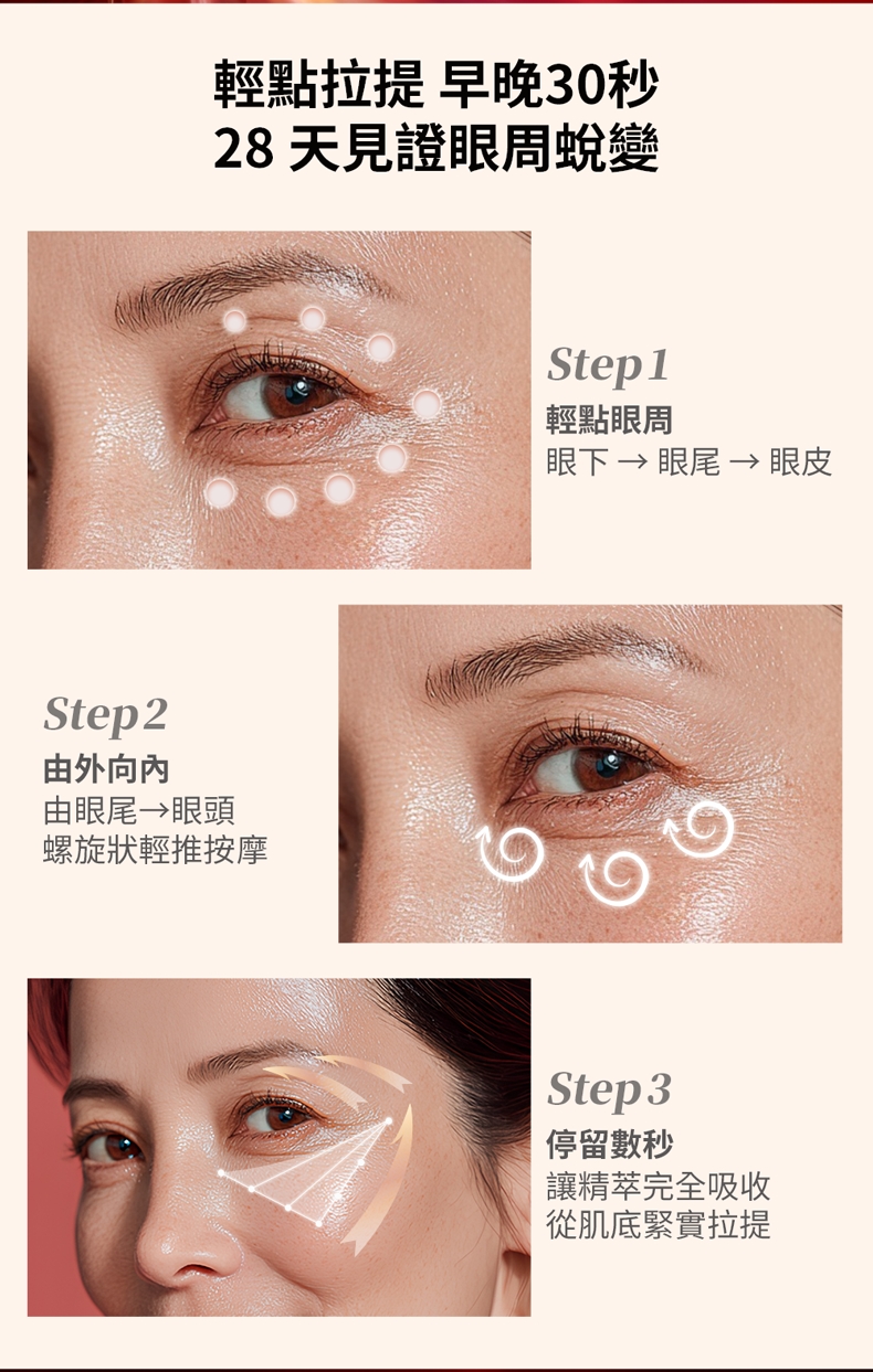 主商品:取適量用指腹輕柔按摩眼周,再輕點至完整吸收