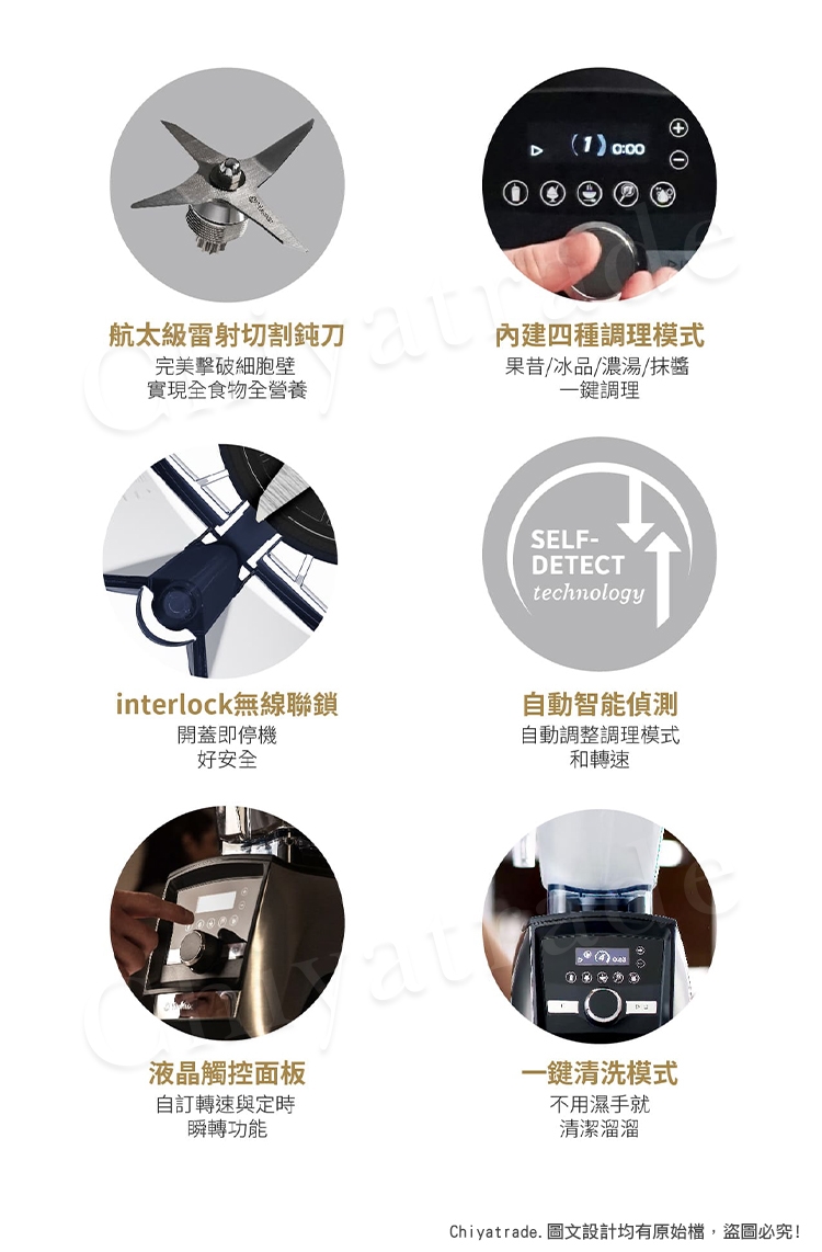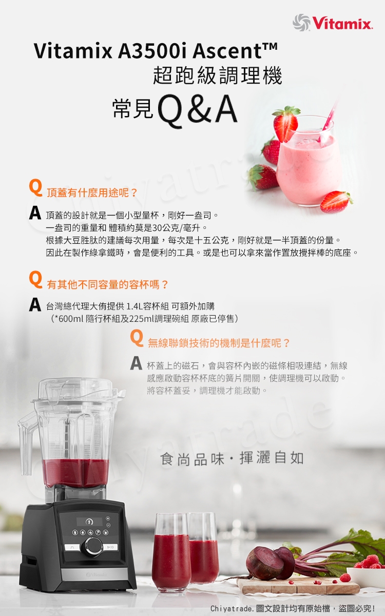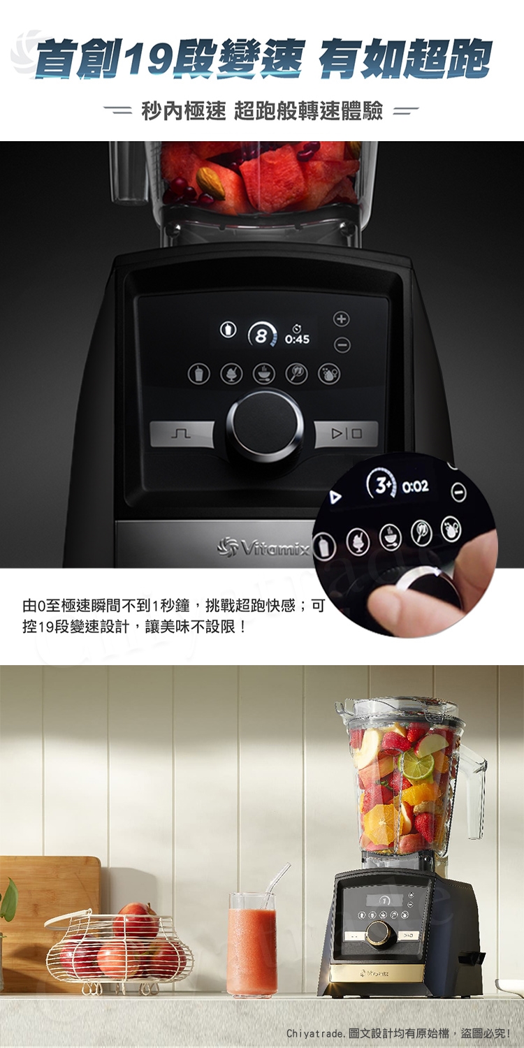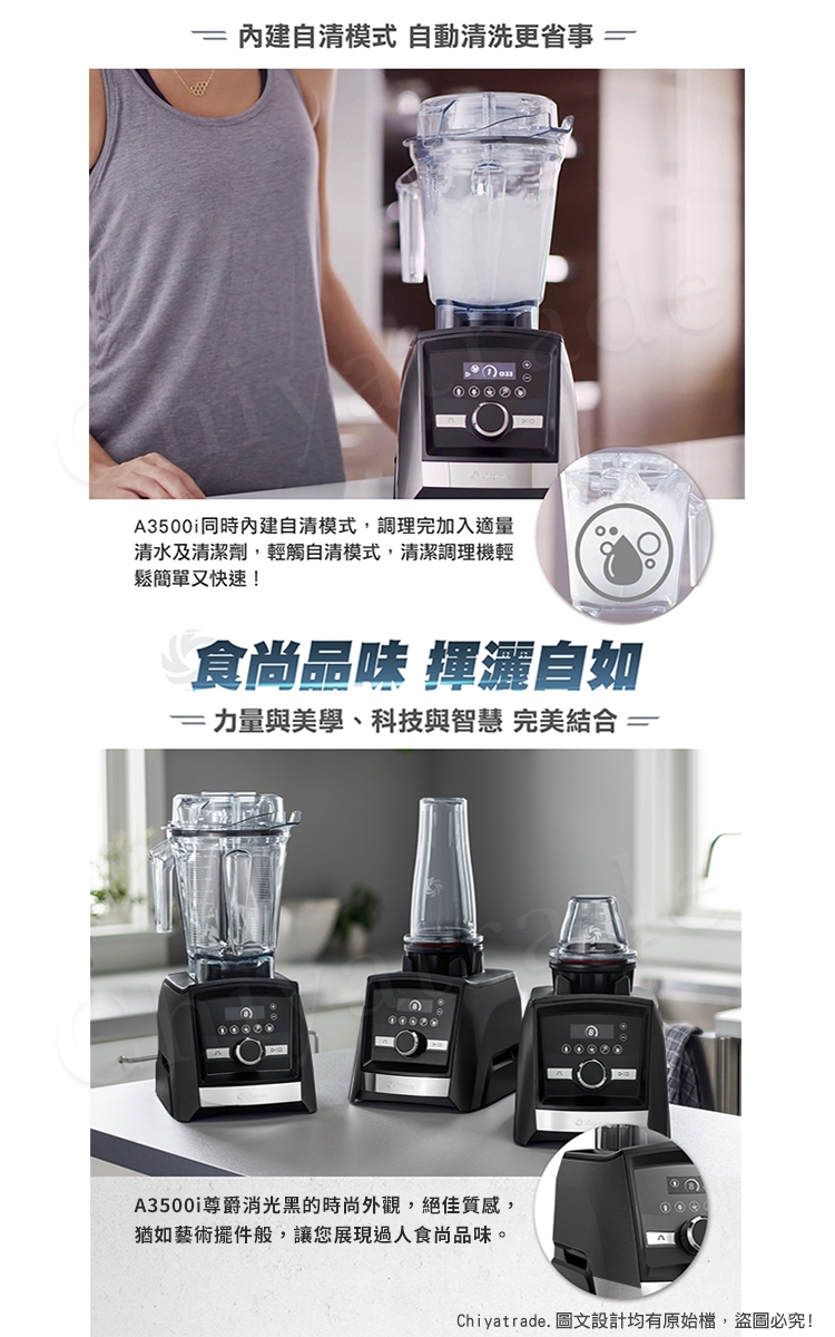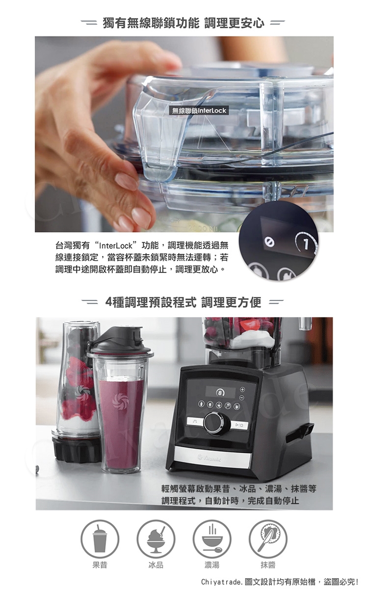 A3500i能自動感應容杯尺寸,自主偵測不同的容杯所需要的調理時間,並透過無線連接鎖定杯蓋,當容杯未鎖緊時,無法運轉。調理中途開啟杯蓋,調理機自動停止,調理更放心。