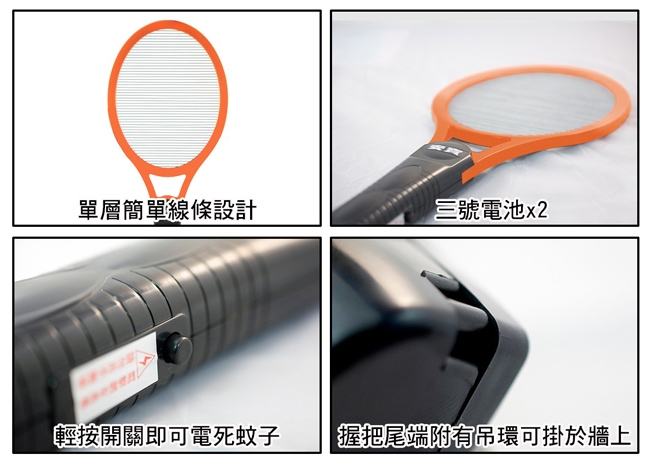 ◎網面洩放電壓安全設計:使用完畢手離,圓型開關即自動洩放網面電壓,不殘留電壓於電擊網上