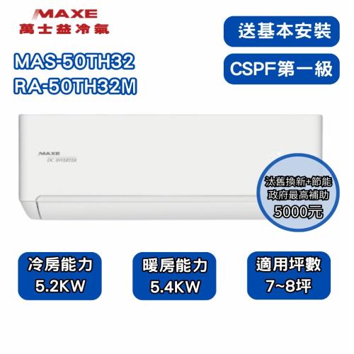MAXE 萬士益 TH鼎極系列 7-8坪 一級變頻雙極離子冷暖分離式冷氣(MAS-50TH32/RA-50TH32)